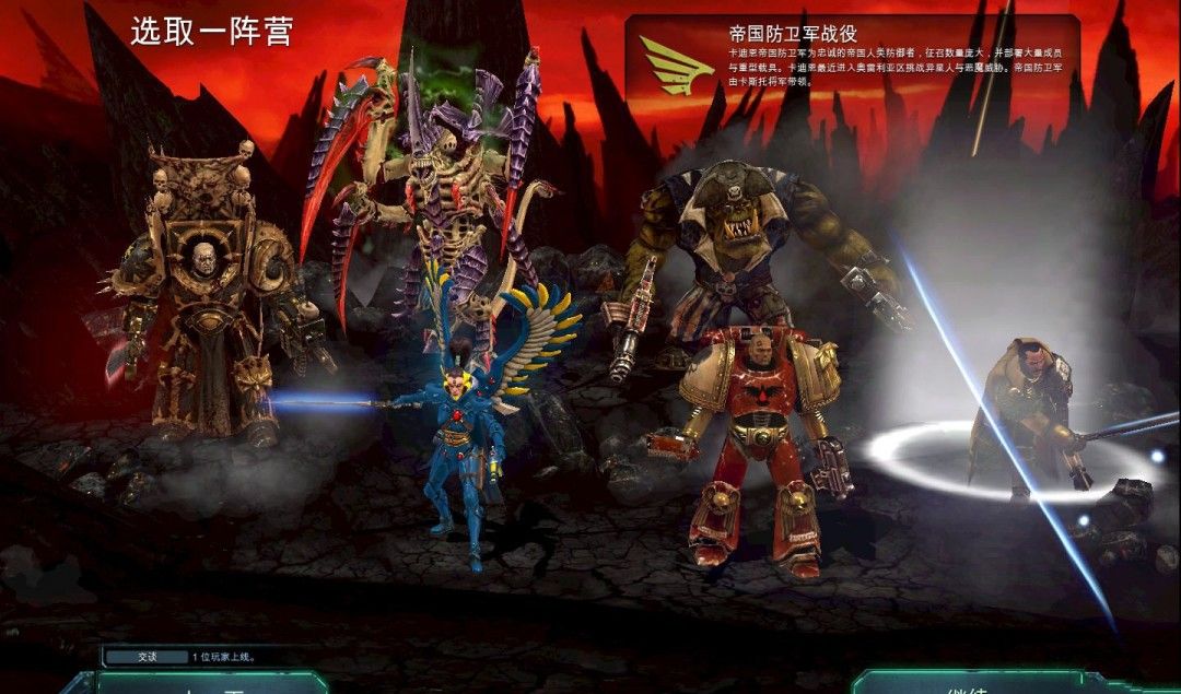 玩家可以选择星际战士、艾达灵族、帝国防卫军、欧克蛮族、混沌星际战士与泰伦虫族6个势力来进行单人战役,每个种族都有16个任务,剧情发展因种族不同而各有特色。