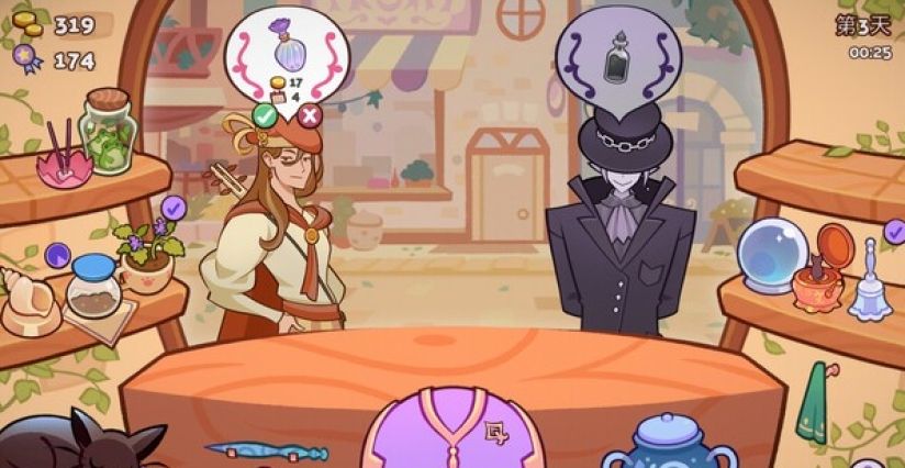 4、当药剂调制完成,真正的考验才刚刚开始——营业时间里,你需要在店铺中接受订单,销售药剂,整理柜台,把小偷变成青蛙!在忙碌的经营中保持专注和敏捷——耐心有限的顾客可不会等太久,而那些小偷总想偷走你辛苦赚来的金币。