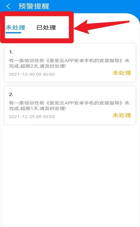 3、预警提醒页面可查看未处理与已处理任务,点击标签页快速切换查看处理状态。
