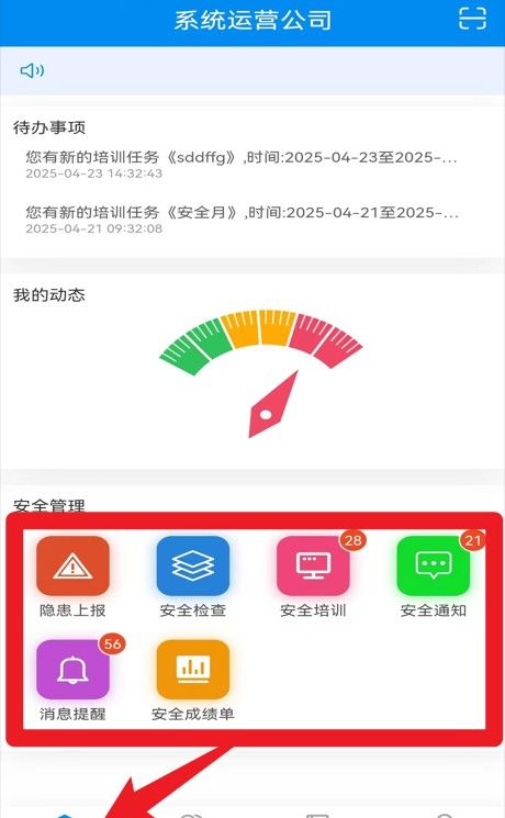 2、首页展示待办事项与我的动态,点击下方安全管理图标可进入具体功能页面。