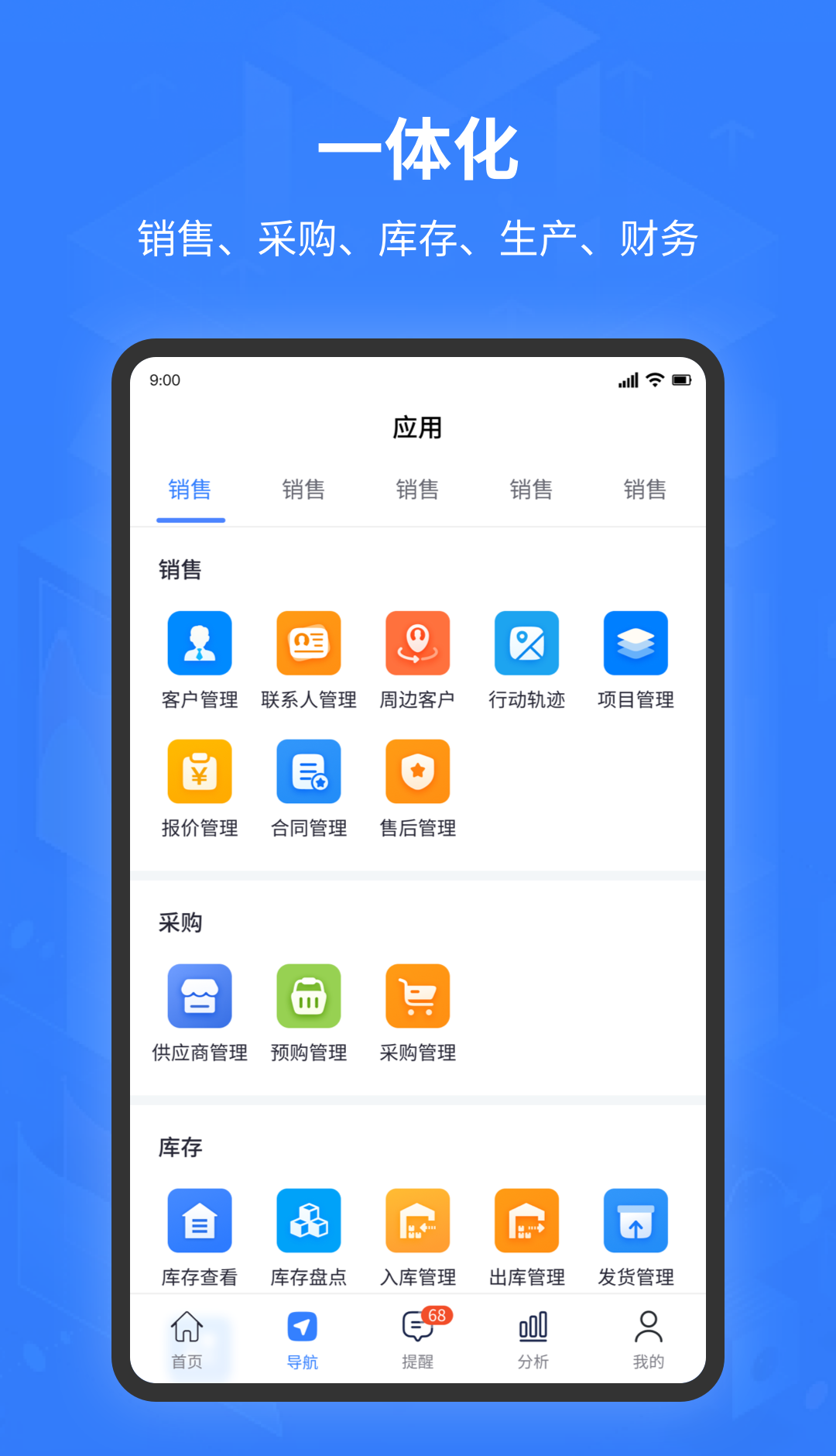 一站式集成日常办公和管理所需功能,客户录入、销售跟进、移动开单、采购审批、库存查询、生产汇报、售后服务、收款付款、业务报表、日程待办、考勤打卡......应有尽有,只需登录,即可实现业务全场景无缝连接。