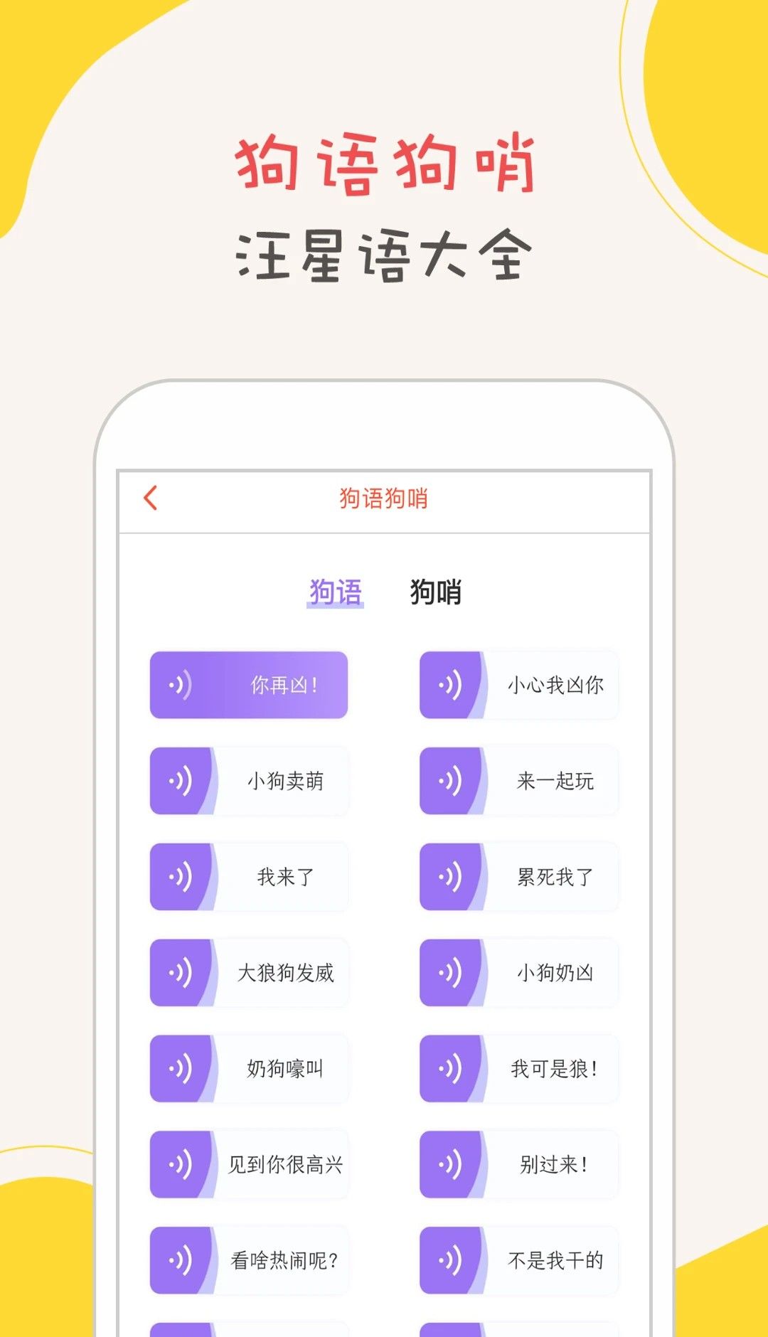 小狗翻译器是一款非常实用的动物翻译软件,拥有简单上手的功能和选项,可以帮助用户轻松翻译各种宠物的语言,随时了解它们在说什么,还能帮助用户准确翻译猫语和狗语,随时随地将用户说的话转换成猫语和狗语,帮助宠物和用户交流,给用户带来全面的服务和体验,还具有简洁的界面设计,无需任何经验即可上手使用,轻松自由进行快速翻译,能完全满足所有使用需求,有需要的用户欢迎来本站下载软件吧。