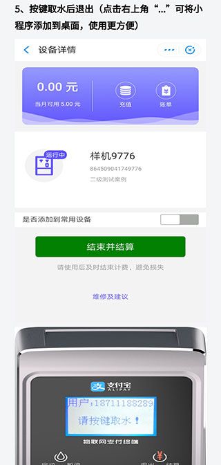 5、按键取水后点击机器上的退出按钮,或者在app上选择结束并结算。