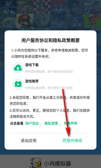 1、先在本站下载最新版本小鸡模拟器极速版安装好,打开后先同意协议和隐私政策。