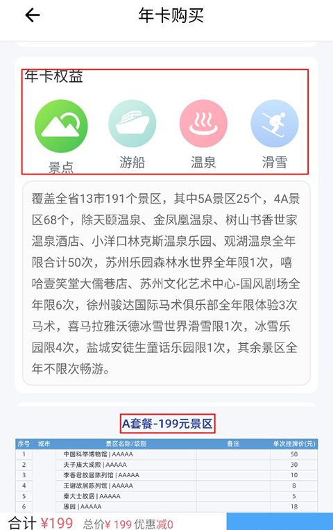然后就可以查看旅游卡权益,选择要购买的套餐,点击右下角的购买即可开通数字旅游卡,免费畅玩江苏各大景点。