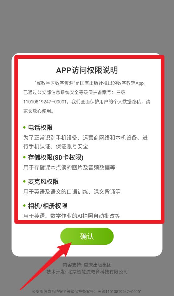 2、系统会提示【APP访问权限说明】,包括电话、存储、麦克风和相机权限,请点击【确认】,以保证功能正常使用。