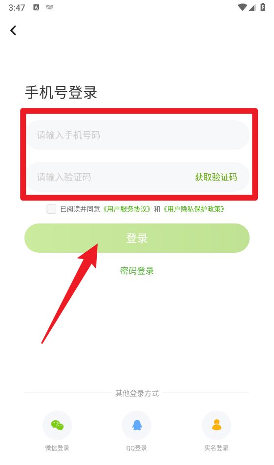 3、在登录界面输入手机号码并获取验证码,确认已阅读协议后点击【登录】,即可快速完成账号注册或登录。