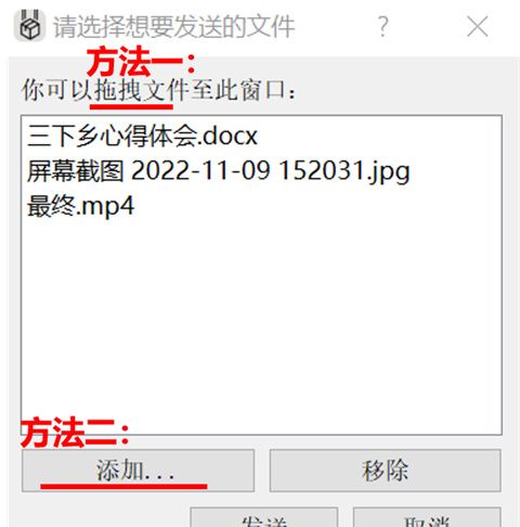 1、首先在电脑端我们将要发送的文件拖到窗口或者按左下角的“添加”按钮,然后点击“发送”。