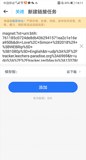 3、然后输入链接地址,支持直链下载和磁力(即bt文件链接下载新形式)、电驴链接(比bt更早的一种下载方式),例如下图中就是输入了一条磁力链接。