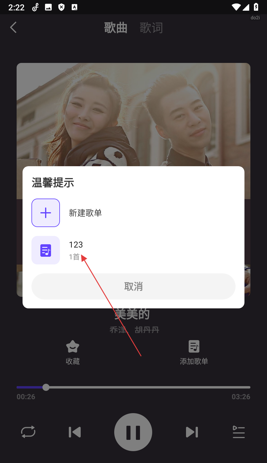 2、在歌曲播放页面,点击【添加歌单】,弹出温馨提示框。