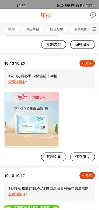 5、点击线报,可以将软件里的商品分享到朋友圈,可获得软件给出的福利。