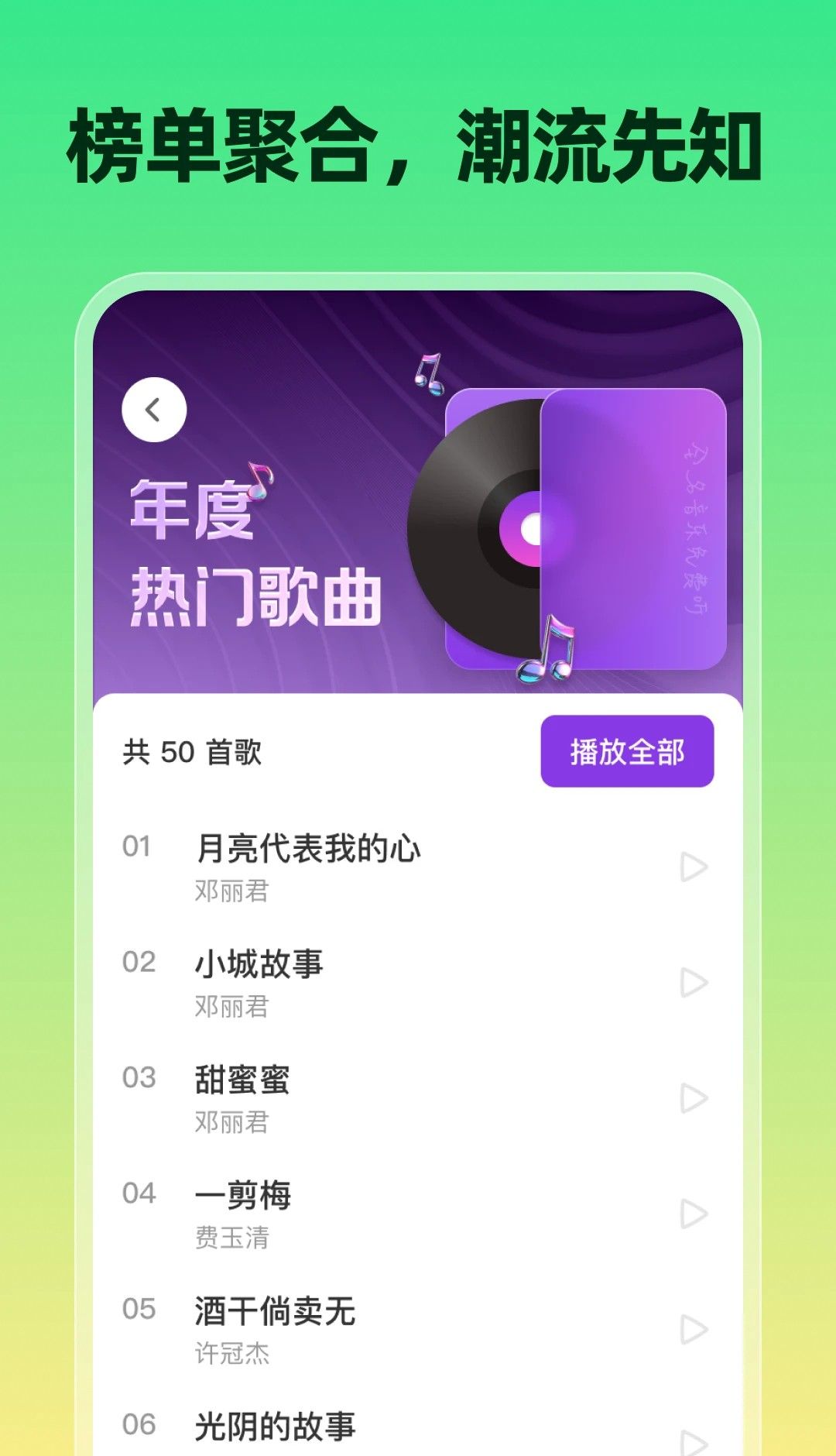 4、界面简洁:界面设计简洁大方,方便用户快速找到自己想听的歌曲。