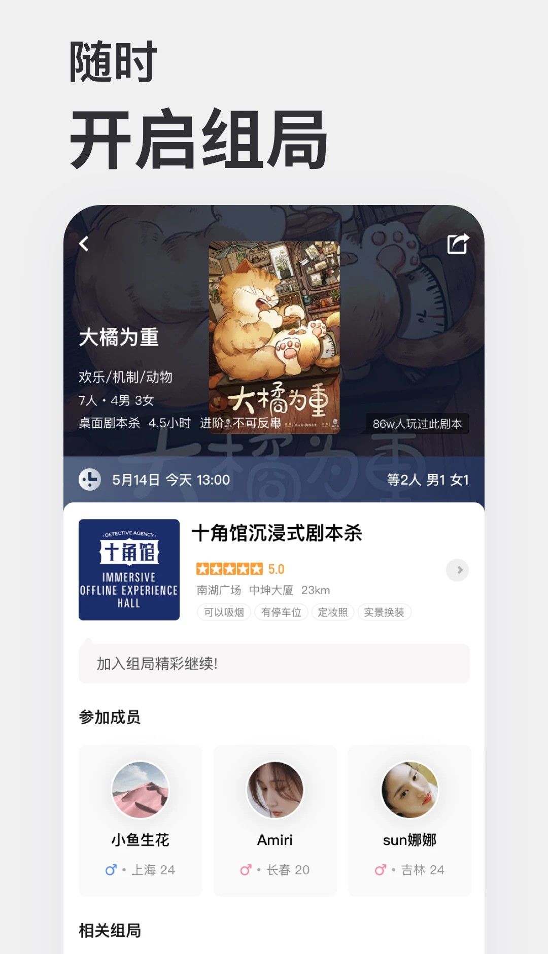 1、社交功能:提供基本悬疑游戏、密室逃生等游戏组织服务。用户可以轻松找到附近的游戏,并与陌生人或朋友一起玩。