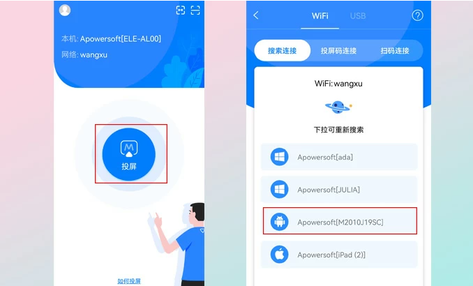 2、在傲软投屏App中,点击中间的【投屏】按钮。选择形如Apowersoft[设备名称]的待投屏设备。