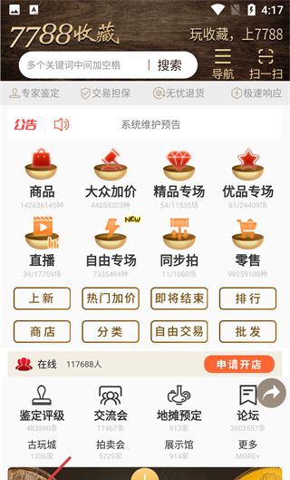 7788收藏app是一款专业正规的古玩艺术收藏品等交易平台。用户可以在这里进行自由、合法、合规的买卖。里面的收藏范围很广,种类繁多。商品数量超过千万件,入驻卖家超过10万。每日在线用户数量稳步增长。该平台将对上市产品进行细致的筛选,以消除假冒伪劣产品。它还支持用户在线拍卖,在拍卖截止日期到来时,出价最高的人将获胜。用户可以与其他爱好者交流,交流经验和分享见解。