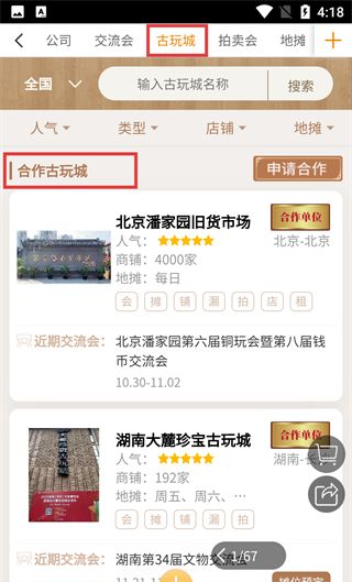4、古玩城板块,展示潘家园、大麓珍宝古玩城,标人气、商铺及地摊时间,方便了解古玩交易市场。