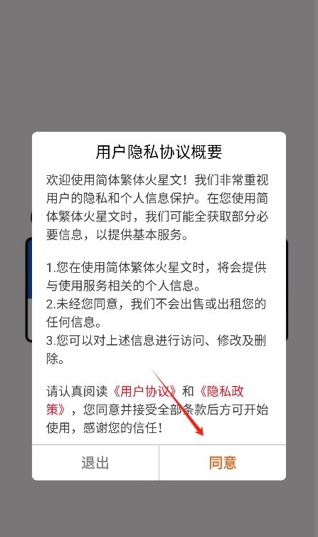 1、在本站下载安装简体繁体火星文转换app并打开,同意相关的用户协议。