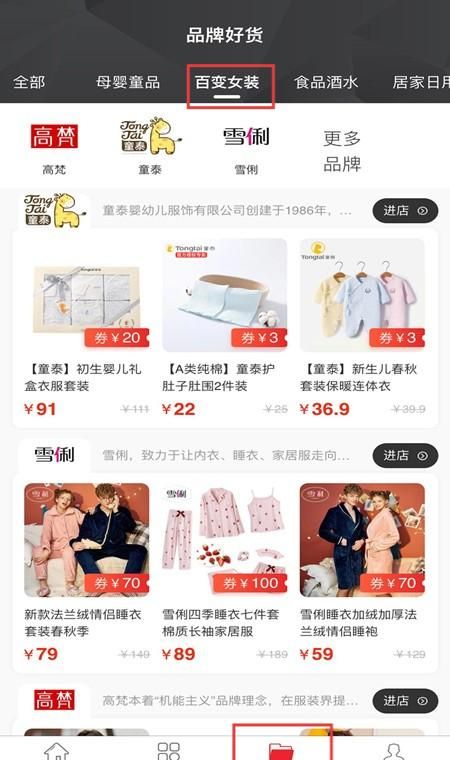 2、可按分类查找商品,如点击百变女装分类,查看高梵、童泰、雪俐等品牌的女装相关优惠商品。