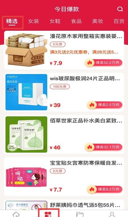 1、进入今日爆款界面,这里展示精选及各品类的爆款商品,可浏览商品优惠信息并按需选购。
