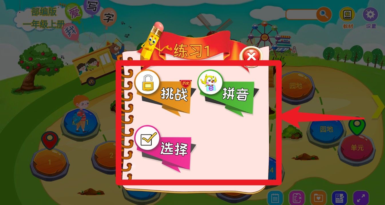 2、在弹出的任务页面中,选择拼音、选择等练习模式,按照图标进入具体的学习内容。