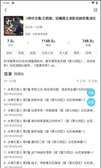 2、成功进入到详细界面中去,在这里汇聚了小说剧情简介以及相应的目录,我们可以直接点击开始播放进行有声小说播放操作。