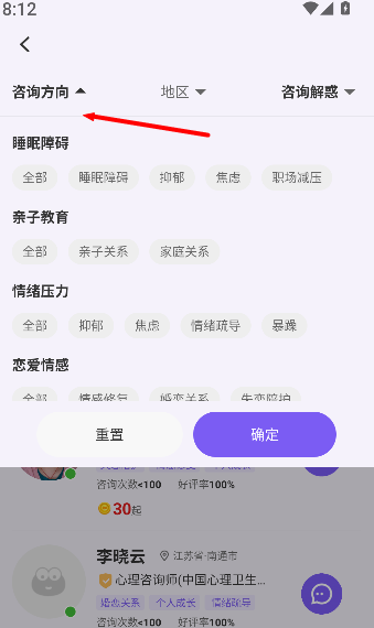 2、在选择页面上,首先要明确咨询方向。睡眠障碍、亲子教育、情绪压力等具体领域都可以作为参考。这有助于更准确地筛选出合适的导师。