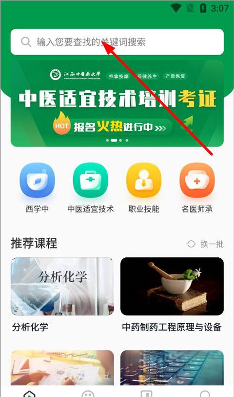 1、打开中医药在线app,注册登录。在主页上,你可以看到“西学中医”、“中医之道”、“职业技能”、“师徒传承”等栏目。也有推荐的学习课程。点击搜索框,输入关键词搜索课程。