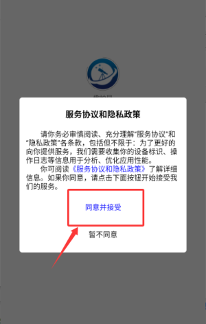 1、打开应用程序阅读服务协议,点击同意并接受进入主页。