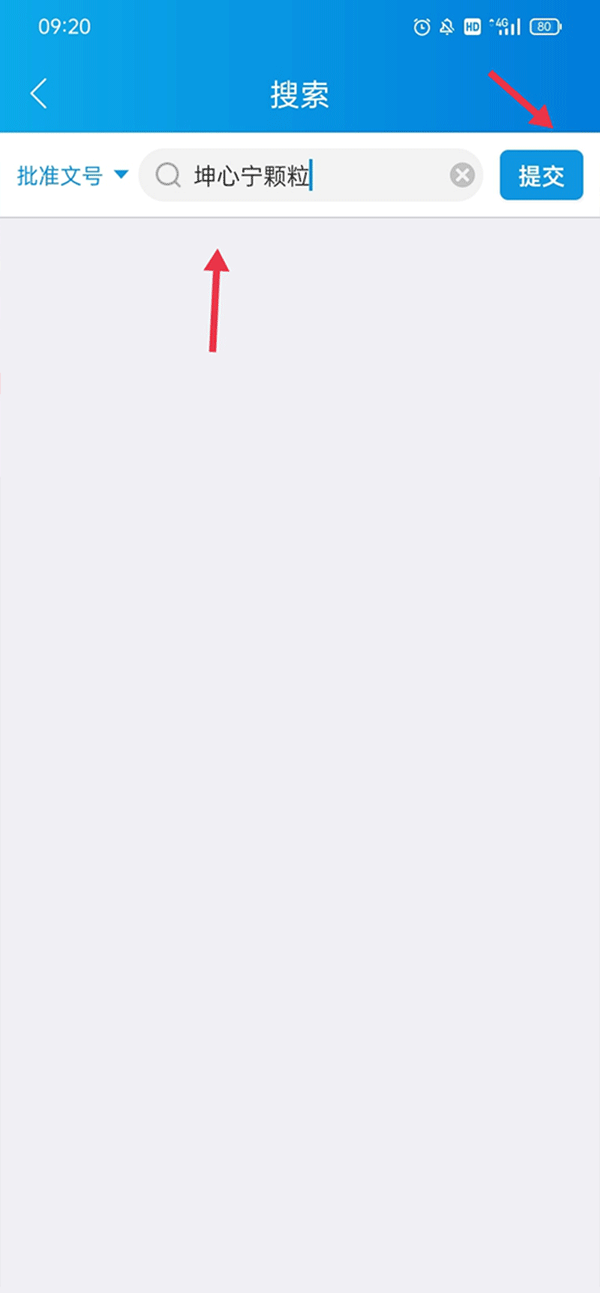 3、输入您要查询的药物,我在这里输入了昆心宁颗粒,点击右侧的提交。