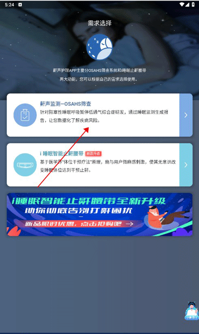 1、睡前打开鼾声护理应用程序界面。