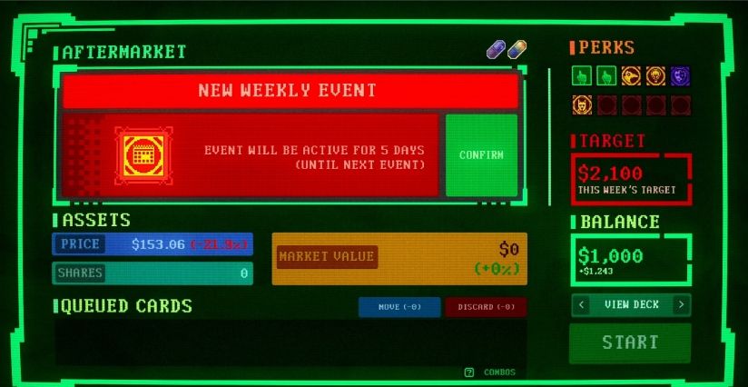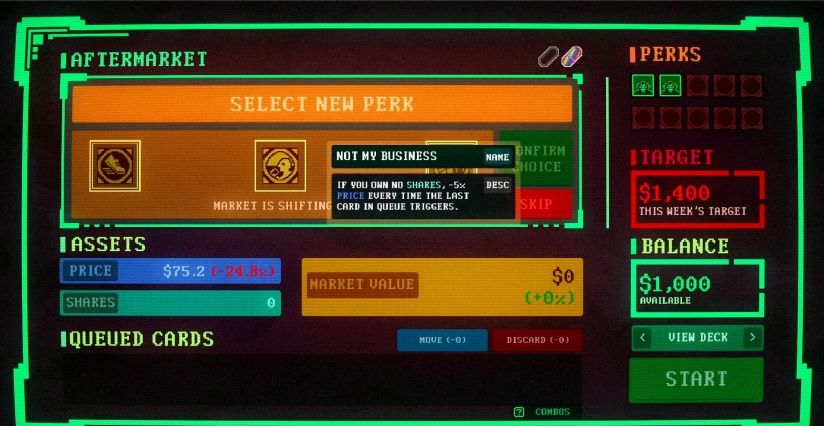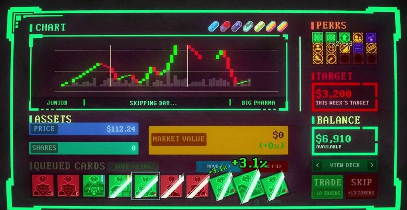这并不是一款股市交易模拟游戏。这是一个由你的选择构成的牌组构建游戏。在休市期间,你可以前往盘后交易市场并在不同卡池中抽取手牌,但要小心,收益往往与风险并存。有些卡牌能够让牌组变得更强。有些则恰恰相反。开市之后,你只能够依赖精心构建的牌组来左右股价走势。
