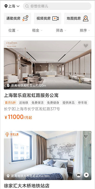 1、下载并登录城家公寓应用程序,进入主页,您可以看到有全租公寓、多人宿舍和城市短期租赁。您可以通过通勤、地图搜索、视频搜索和专人搜索快速找到房子。