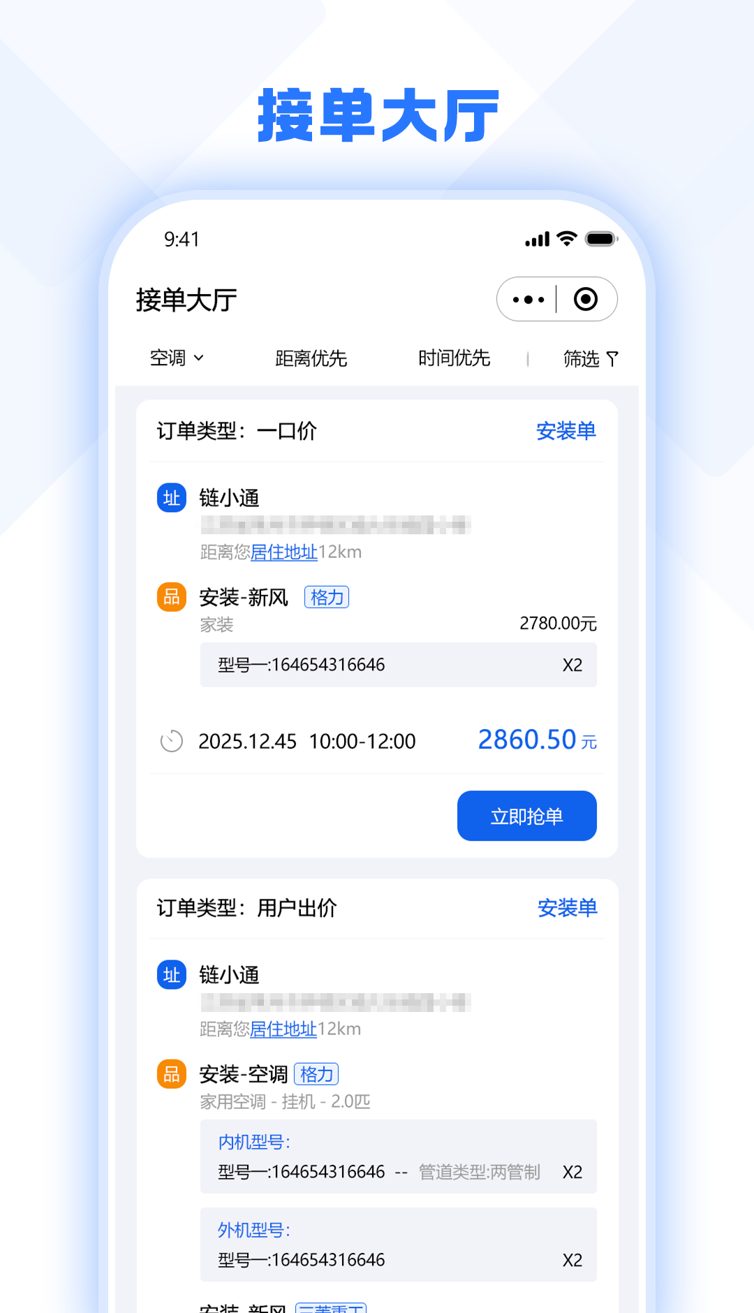 1、接单大厅与订单高效管理。各类安装维修订单清晰展示,师傅可按技能与时间自主选择合适订单。订单管理支持进度查看与事项确认,避免信息错误与工作失误。