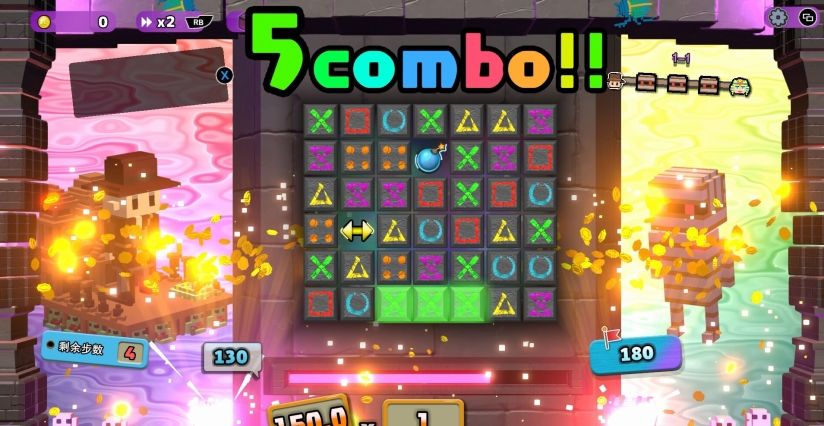 游戏核心玩法巧妙融合了肉鸽的随机性、三消的爽快感与解谜的策略性。玩家需在限定步数内达成目标分数,通过连接同色方块打出连击,在有限的回合数内造成伤害、击败敌人。游戏独创“魔方滑动”玩法,玩家可以自由移动选中的方块到任意位置,触发连锁反应。每局通关后,玩家可选择各具特色的“遗物”来强化自身,游戏中共收录超过160种遗物。