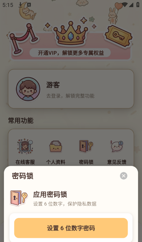 2、然后在个人中心界面,找到“常用功能”下方的“密码锁”按钮选项点击。