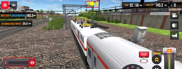 7、当我们需要刹车是,可以拉下右下角的brake按钮,拉动他就可以完成制动,右上角还有切换火车控制视角、喇叭、等按钮,完成游戏的任务获得胜利。