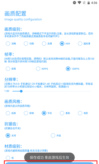 5、在画质配置界面中,选择各种选项,如您想要的画质级别、帧率、分辨率和画质样式。