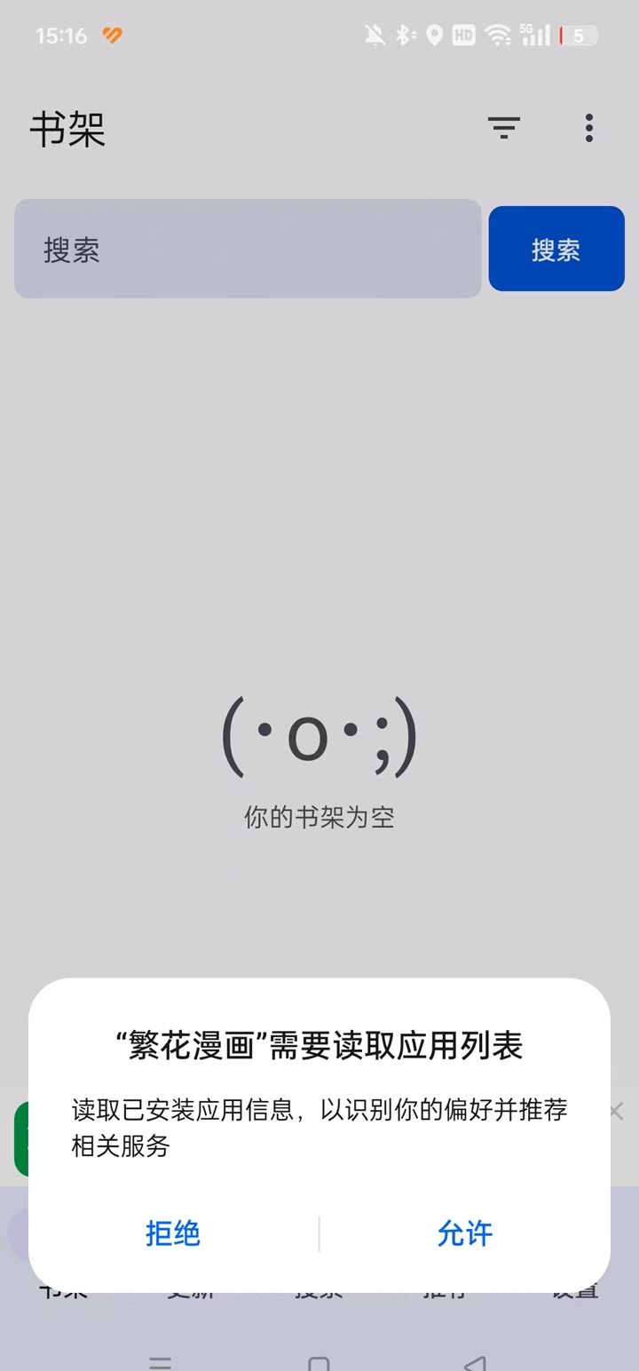 2、阅读完成后,可以看到【书架】、【更新】、【搜索】等栏目中并没有像其他漫画软件那样,展示出详细的分类。