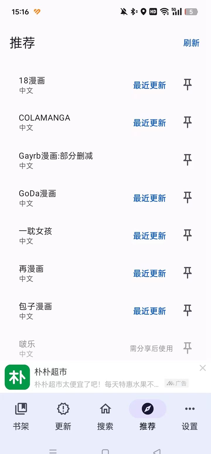 3、我们只需要找到底部的【推荐】功能栏就行,这里内置了超多其他漫画的阅读源,无需导入,自由使用。