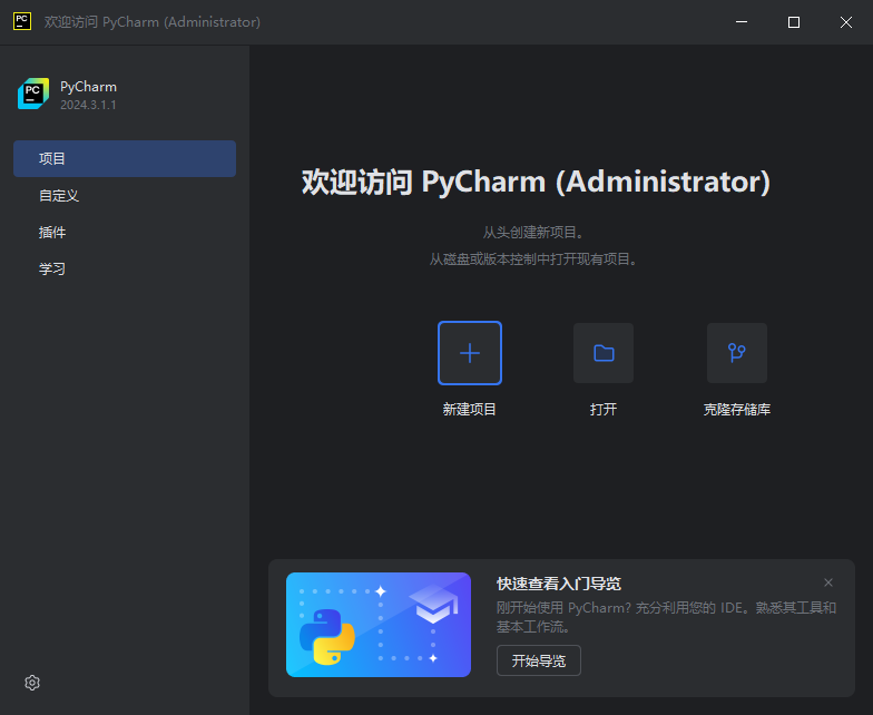 1、在本站下载安装并打开 PyCharm v2024.3.1.1 社区版,此版本自带中文语言包,在安装完成后打开的第一个界面就能显示中文,直接点击下一步