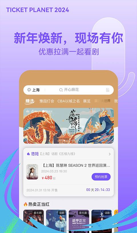 票星球最新版是一款票务app软件,适用于在手机上快速获取名人演唱会、文化演出等娱乐活动的门票。在这个应用程序中,用户不仅可以抢购音乐会、音乐节、脱口秀、舞台表演、体育比赛、展览等的门票,还可以从平台或门票来源官方提供折扣,使每个人都能更实惠、更方便地买票。同时,可以根据用户的实际地理位置向用户推荐附近的高质量票源信息。当然,用户还可以通过应用程序中的搜索功能快速搜索全国所有地区的娱乐门票来源信息。