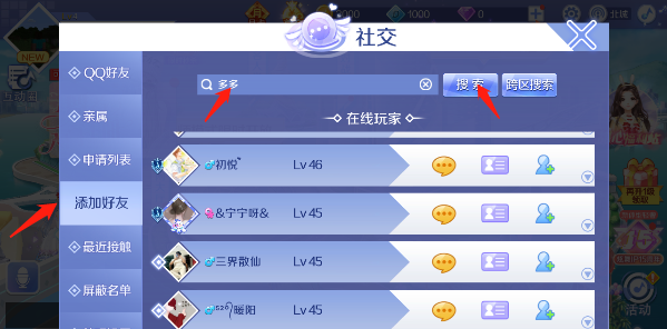 3、在社交界面选择添加好友选项,在输入框输入好友的游戏名称,点击搜索。