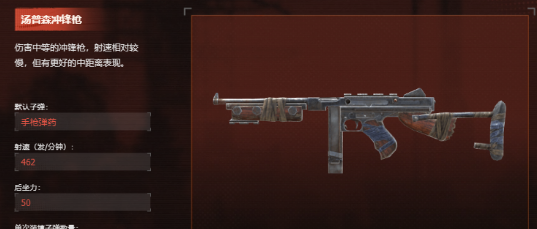 汤姆逊冲锋枪是一个属于伤害中等的冲锋枪,在中近距离的时候,他可以发挥出极好的战场优势,并且冲锋枪还有着比较高的射速,它可以在敌人悄悄靠近时,快速进行射杀能够,直接对对面的火力进行压制,所以在中等这个距离进行冲突的时候,汤姆逊冲锋枪可以给玩家们迅速带来战斗节奏,他的单次子弹数量也适中,刚好有20发,当距离合适的时候,冲锋枪会给玩家们带来更多惊喜。
