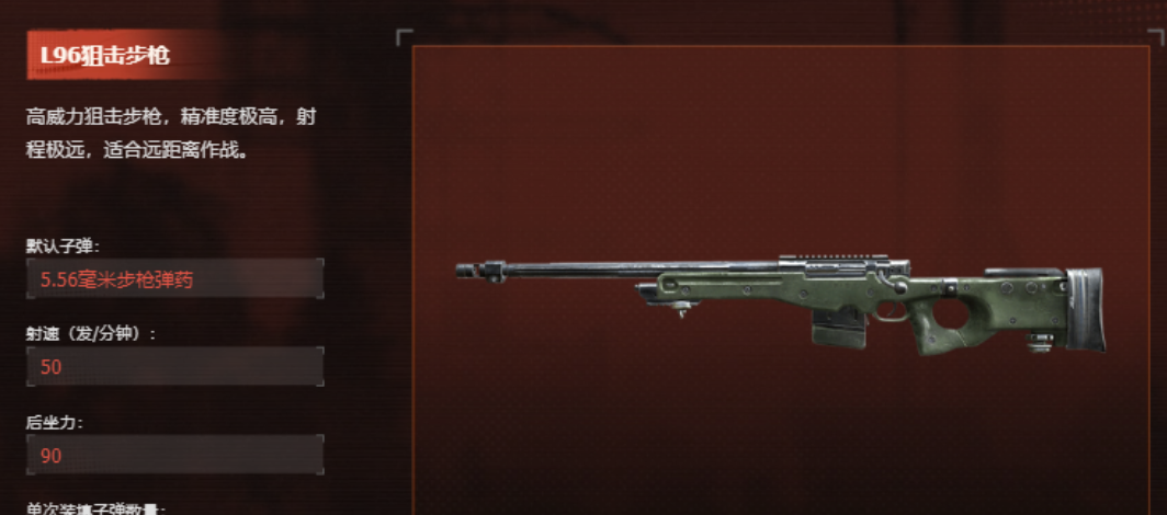 而所有武器中步枪自然也拥有着远距离的步枪这一类型,L96狙击步枪就属于可以远程输出的步枪,之所以能够远距离输出是因为它本身的规格达到了军用级别,整个武器精准度也是相当之高,但是他单次中能够装的子弹非常少,只有5颗,它的作用主要就是靠伏击敌人,在敌人还在远距离进行靠近的时候,玩家们就可以使用这个武器进行拦截。