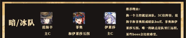 在这个队伍里面其实有两个比较核心的角色,就是范海辛和伊莱莎,其实大家在玩这款游戏的时候就会发现,在配队上面很多情况下都是只有一个核心C位的,但是在这个队伍里面有两个核心角色,这两个角色目前的话,如果用伊莱莎做主控就是冰队,换另外一个范海辛主控的话,就会变成暗队,所以这里的话,大家使用冰队上面的效果,就可以看到其中搭配起来是3C位的一个阵容,范海辛本身是暗队的一个角色,所以大家如果要组成暗队buff的话,这里可以选择另外的自由位上面放菲奥这个角色,如果大家走冰队的话,其实这里菲奥跟伊莱莎的组合也是比较固定的。