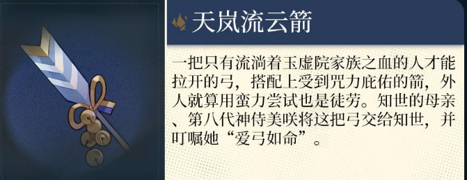 在技能上面,知世使用的武器叫做天岚流云箭,这是一把玉虚院家族里面的人才能使用的武器,在输出的时候一般都会带上庇佑的效果,在一下中使用技能的时候,知世可以带来一个叫做破魔的普攻,在进行普攻攻击的时候最多是可以带来4段连续攻击的,而且可以造成一定伤害之后还可以给敌人带来削刃的效果,在第4段攻击里面,她还可以给敌人施加一个封印的能力,如果此时以蓄力的方式进行技能使用,这个技能还会变成驱秽的效果,射出一支射程相比普攻来说更远一些的箭矢造成伤害。