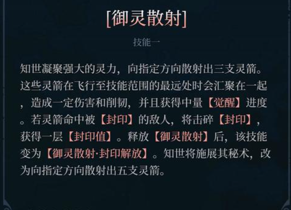 如果是退出狩这个状态的话,则会清空自身之前所有获取的封印数值,而天岚流云的效果就是会将知世提供的伤害加成达到一定的上限,然后还会获得额外的攻击距离,所以对于这类角色来说,带来的增益是比较多的,但是如果此时移动或者闪避的话,就会减少一定的距离效果,所以如果大家使用这个被动的话,就一定要注意此时就是她所在的位置,如果是使用御灵散射这个技能的话,其实就是就会利用自己的灵力带来3次灵箭输出,这些灵箭在达到技能范围最远的时候就会达成合体的效果。