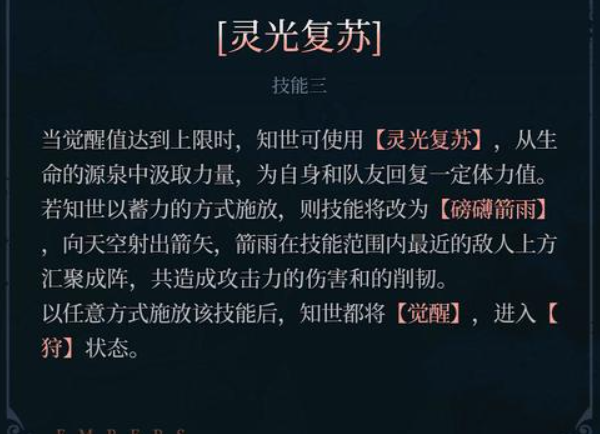 她的技能3叫做灵光复苏,也就是在觉醒值达到一定上限之后,就可以使用这样的灵光复苏带来一定的恢复效果,这里恢复的体力数值是给自身以及队友同时进行恢复的,如果前期有蓄力的话,那么这个技能就会变成磅礴剑雨的效果,剑雨技能范围之内生效的话,对敌人都会造成一定的阵法输出,同时造成攻击力伤害和削刃的效果,这个技能在释放之后只是将进入一个觉醒的状态,也可以触发她的被动效果。