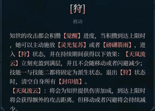 知世的被动叫做狩,就是在攻击的时候只要达到了一定的觉醒进度,那么此时积攒达到上限数量的时候,她就可以主动释放灵光复苏的技能,或者是使用磅礴剑雨这个技能,此时的话就会进入这个被动的状态,也就是狩状态里面,只要是在这个被动状态里面,知世就可以获取天岚流云的效果,这个状态会立刻冲到满层的效果,并且不会随着角色移动或者是闪避来减少数值,技能1以及技能2的话,此时都会变成派生状态。
