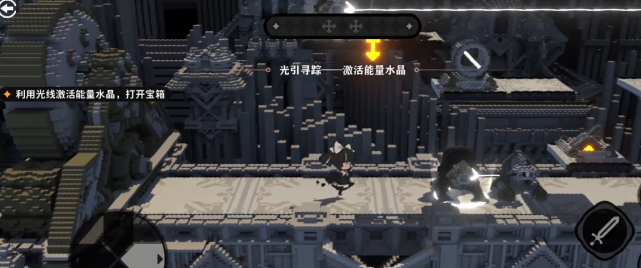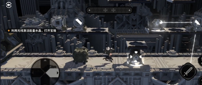 在进入到第1个关卡时,难度真的很简单。玩家可以开启寻宝人的挑战,先直接跳到第1个交互点,接着又跳到第2个交互点完成光线的调整之后就可以拿到奖励。那第2个关卡就是直接跳到平台上,接着跳到第2个平台,只需要点一下交互,就可以让镜面翻上去。这个时候的平台就可以慢慢的降到底,等到落地之后往左边跳,可以精准的落到中央交互点的位置。